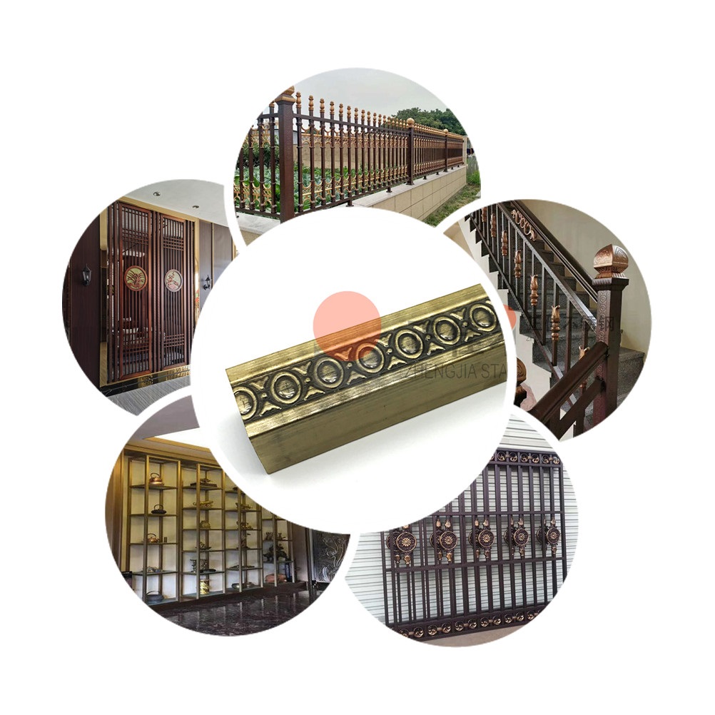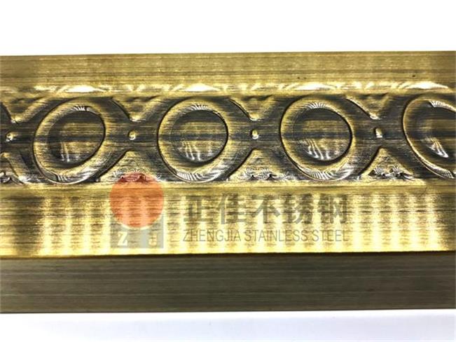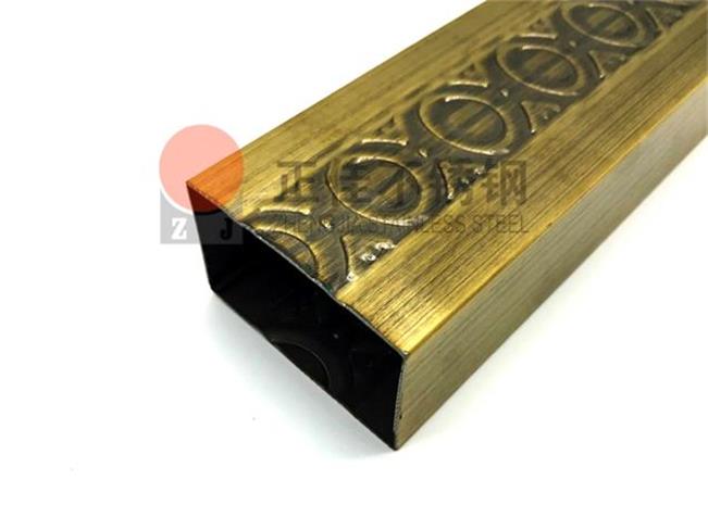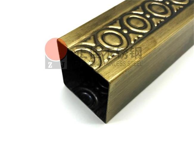 本款產品是新型的藝術不銹鋼管,在不銹鋼管的表面壓出元寶花紋再利用鍍銅使不銹鋼管表面呈現古銅色,可定制個性化花紋。
